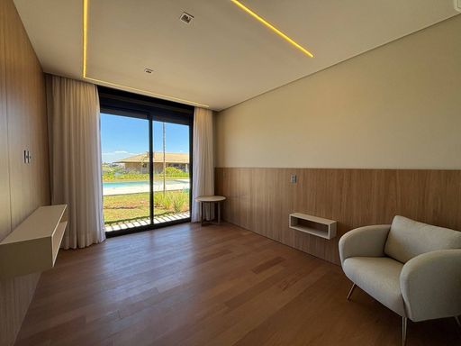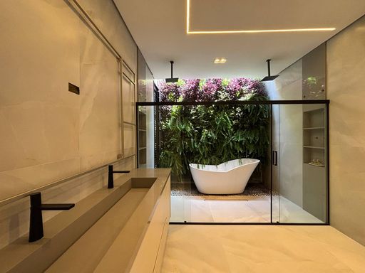- 5 suítes, sendo a máster com vista para dois jardins, closet refinado, penteadeira e banheiro com cubas duplas, chuveiro duplo e jardim interno