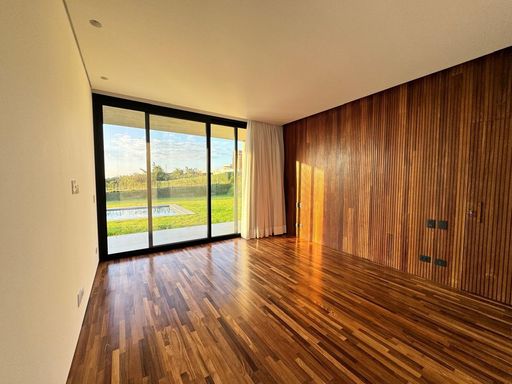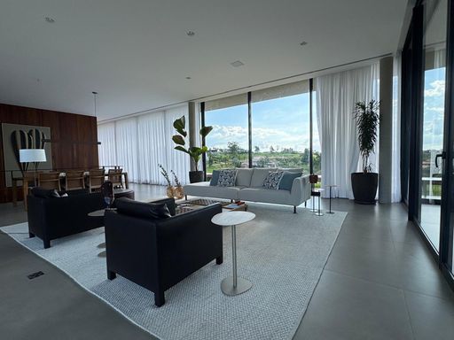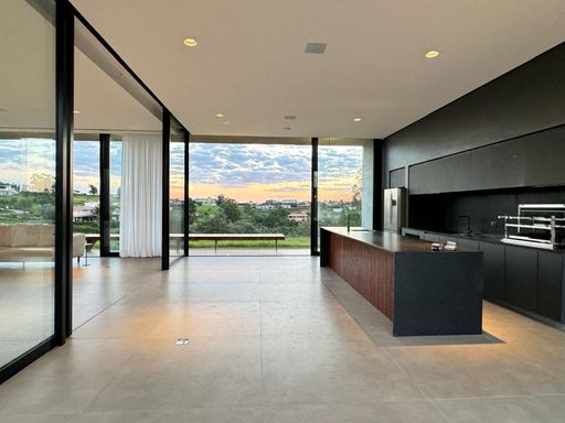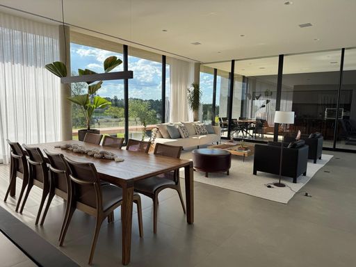 A casa dispõe de amplas salas integradas, com lareira e home theater, que se abrem para uma varanda com vista encantadora do condomínio. O ambiente foi projetado para oferecer conforto, privacidade e sofisticação em cada detalhe.